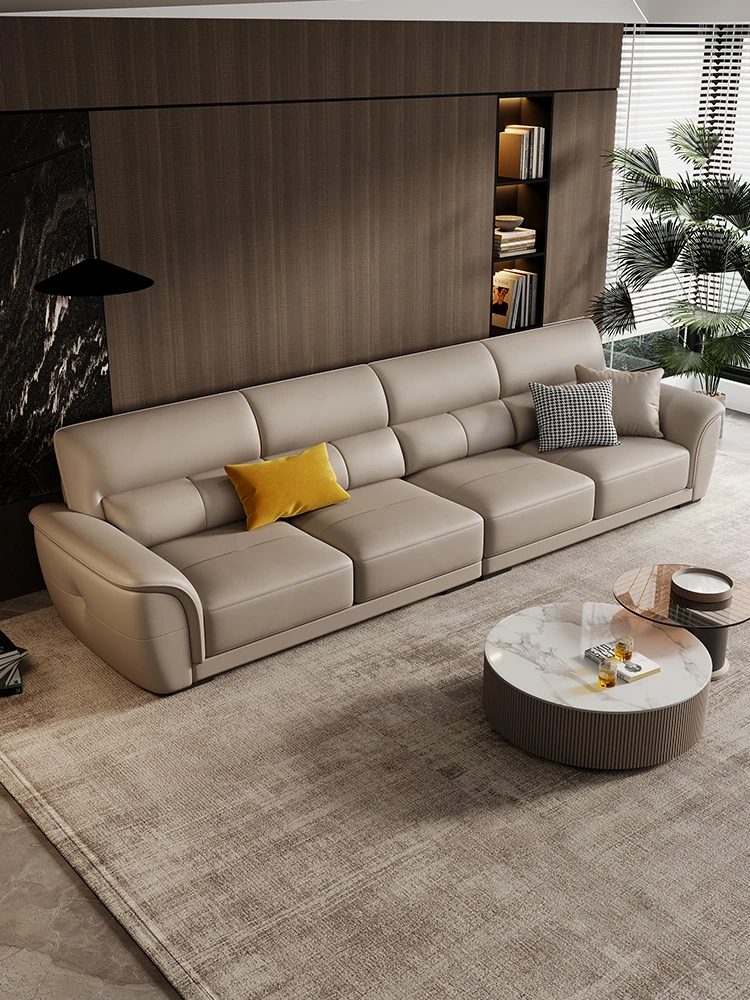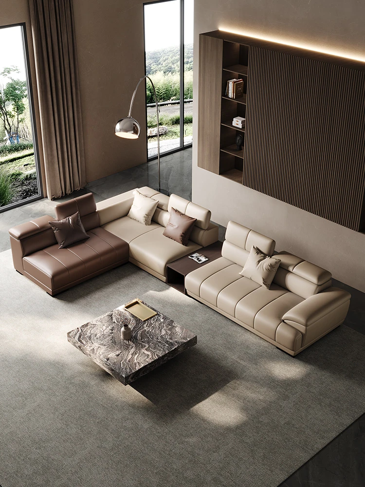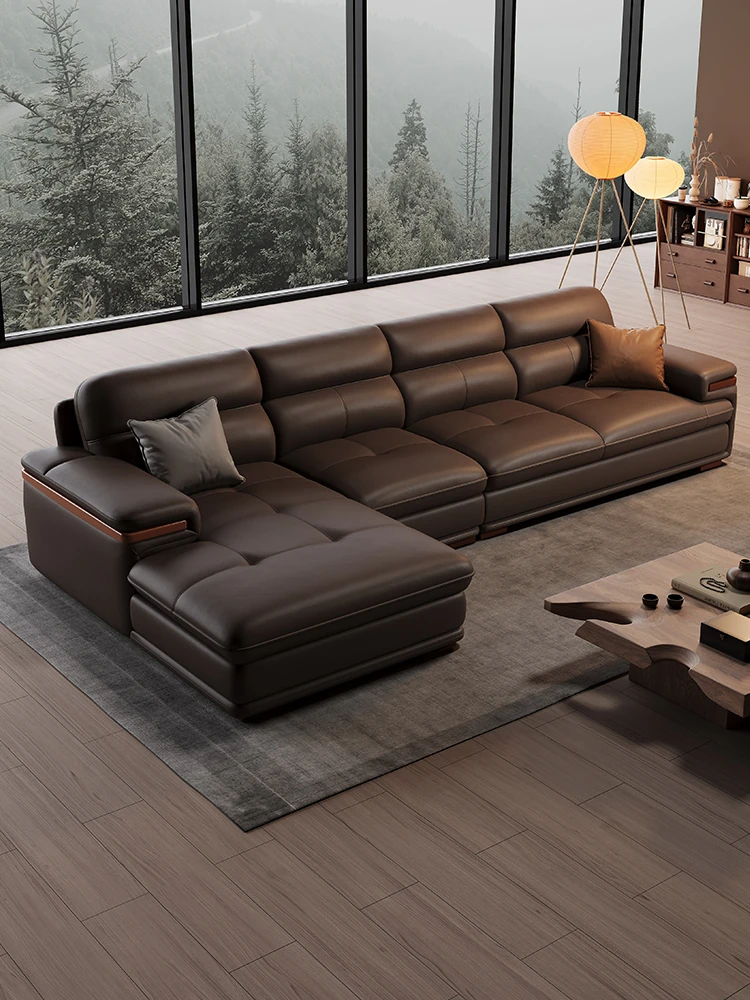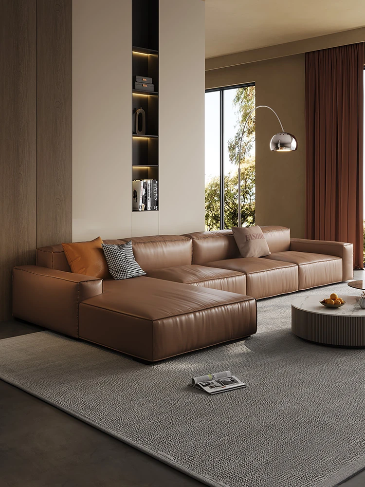 Premium Genuine Leather Sofa Set - Modern Minimalist Design for Large Living Rooms, Featuring Left and Right Chaise Lounge, Perfect for Nordic Style Interiors.