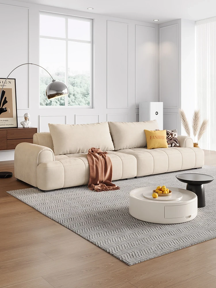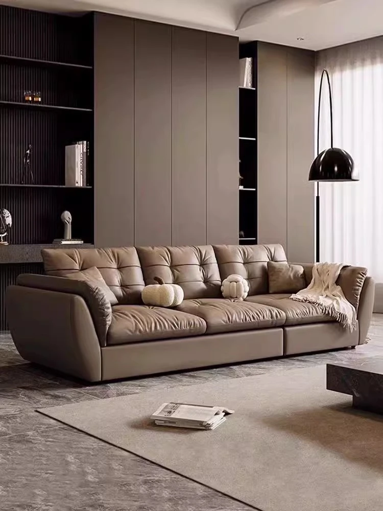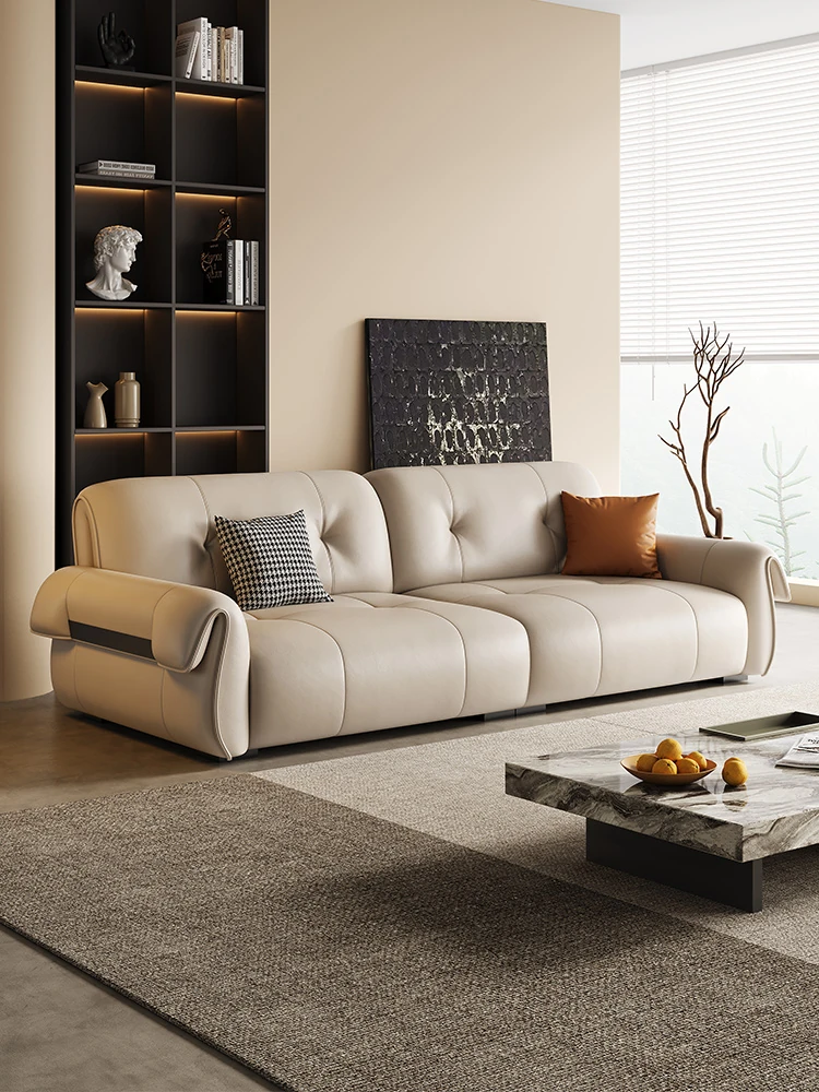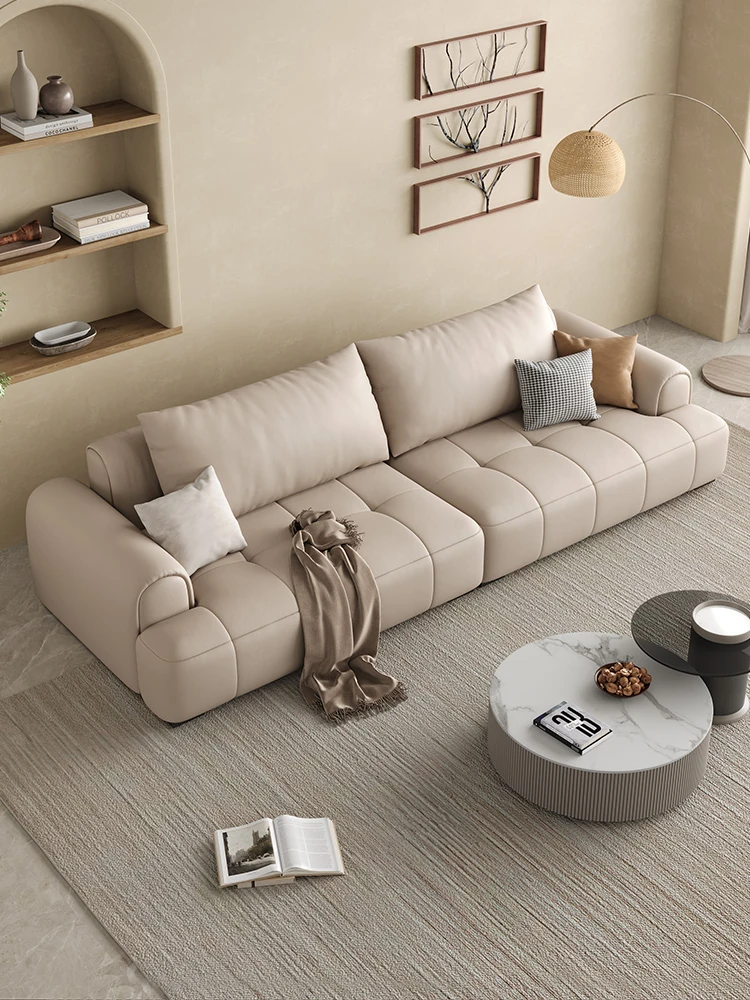 Luxurious Real Leather Sofa - First Layer Cowhide, Plush Marshmallow Cream Style, French-Inspired Living Room Sofa with Straight Piano Key Design