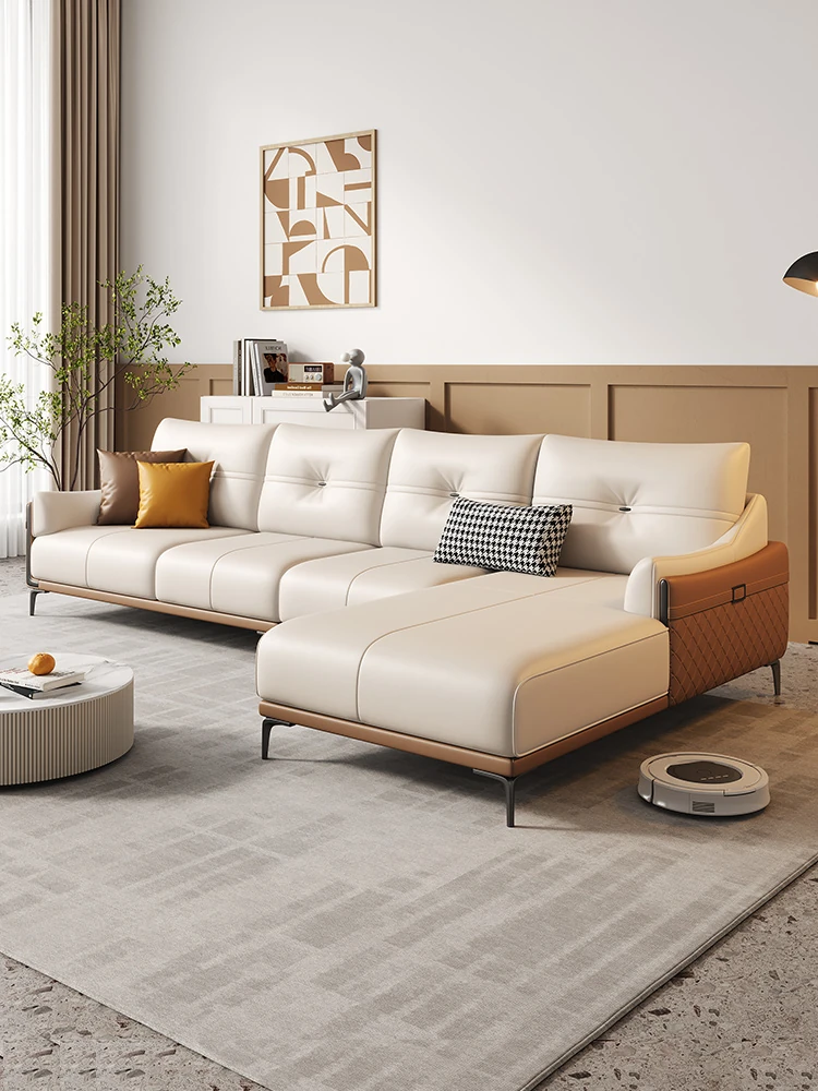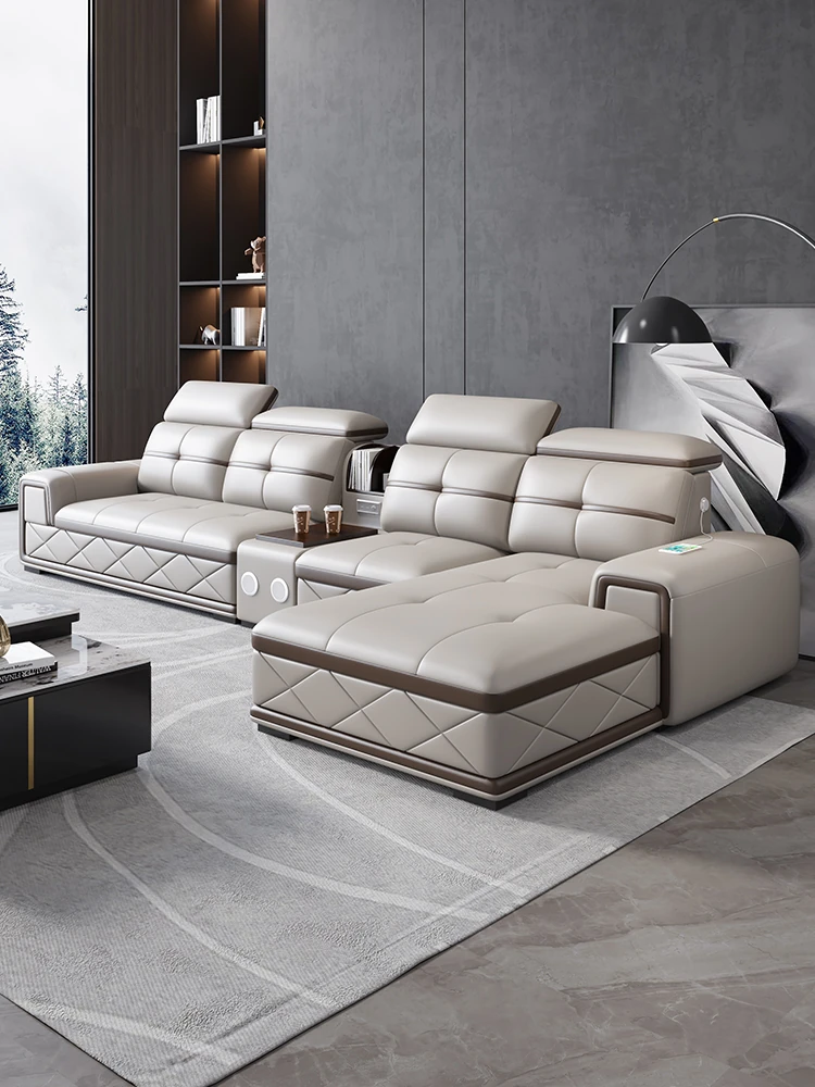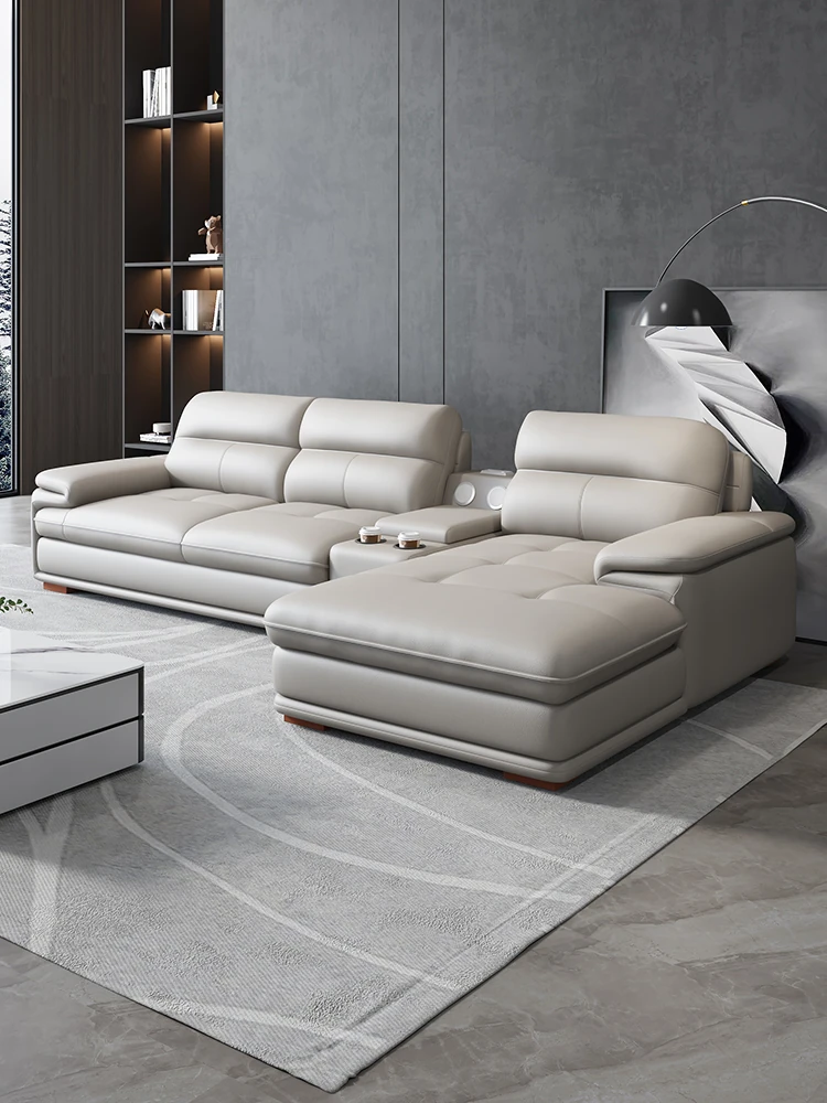 Nordic Genuine Leather Sofa Set - Modern Minimalist L-Shaped Design with Music Side Table and Chaise Lounge for Stylish Living Room - Premium Top-Grain Cowhide Upholstery