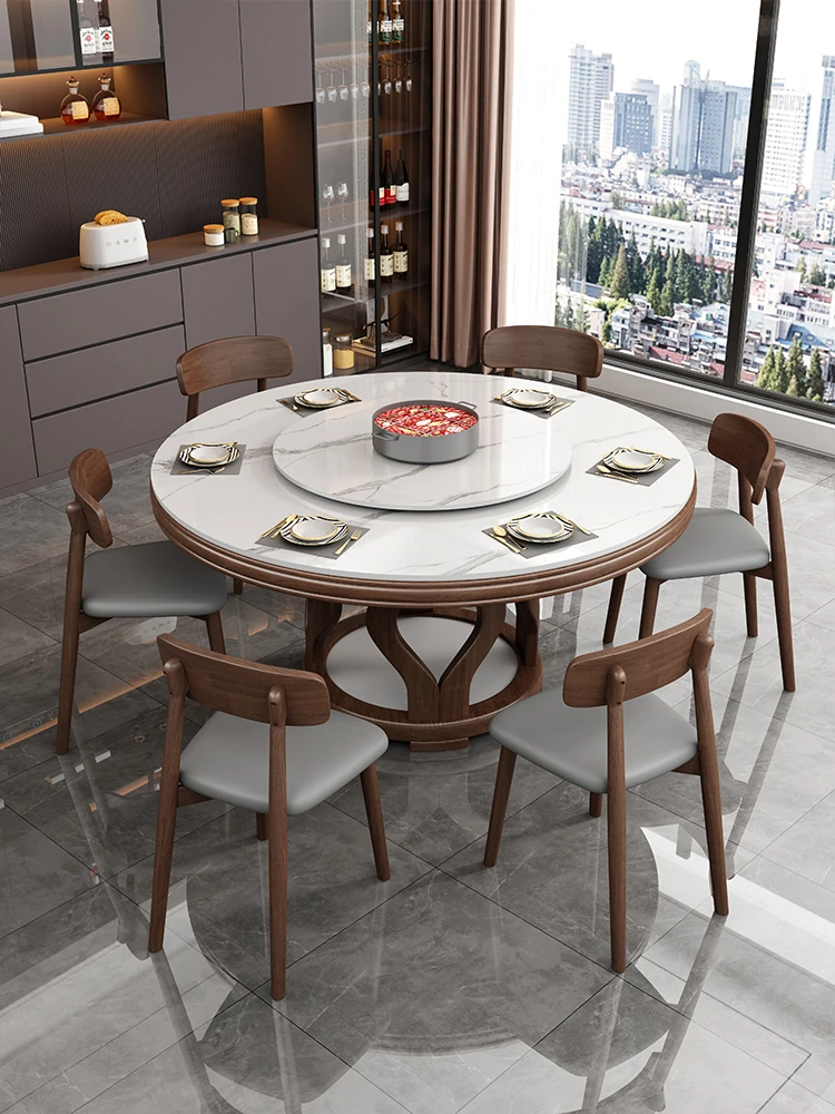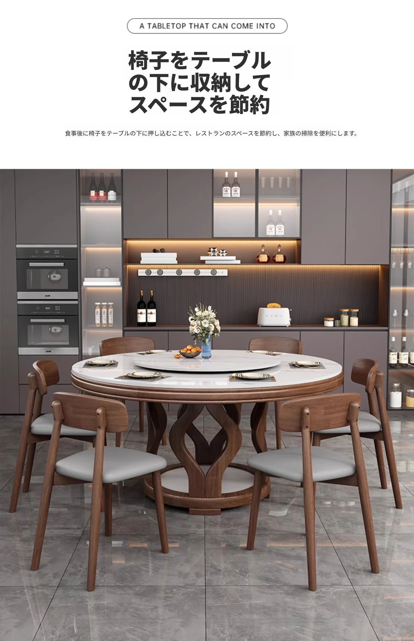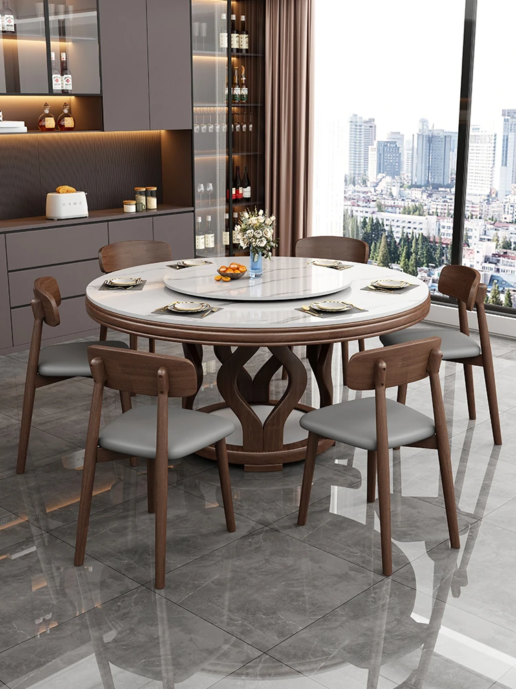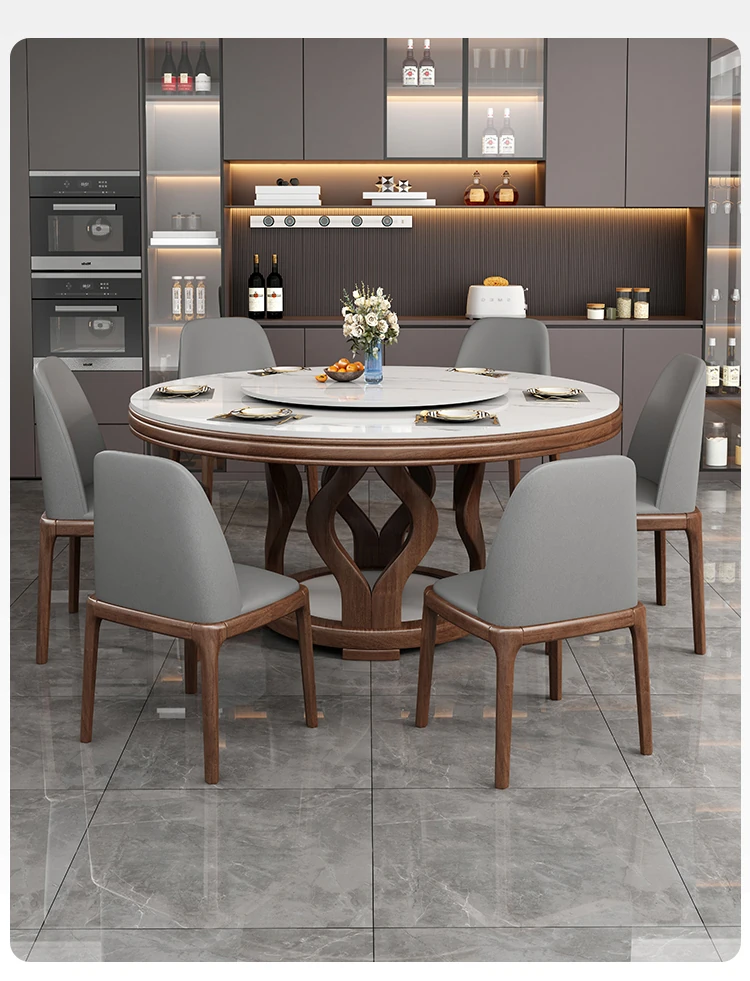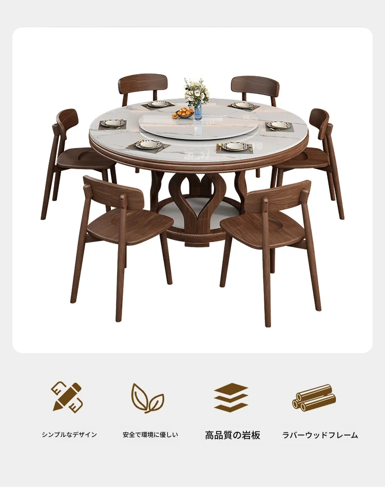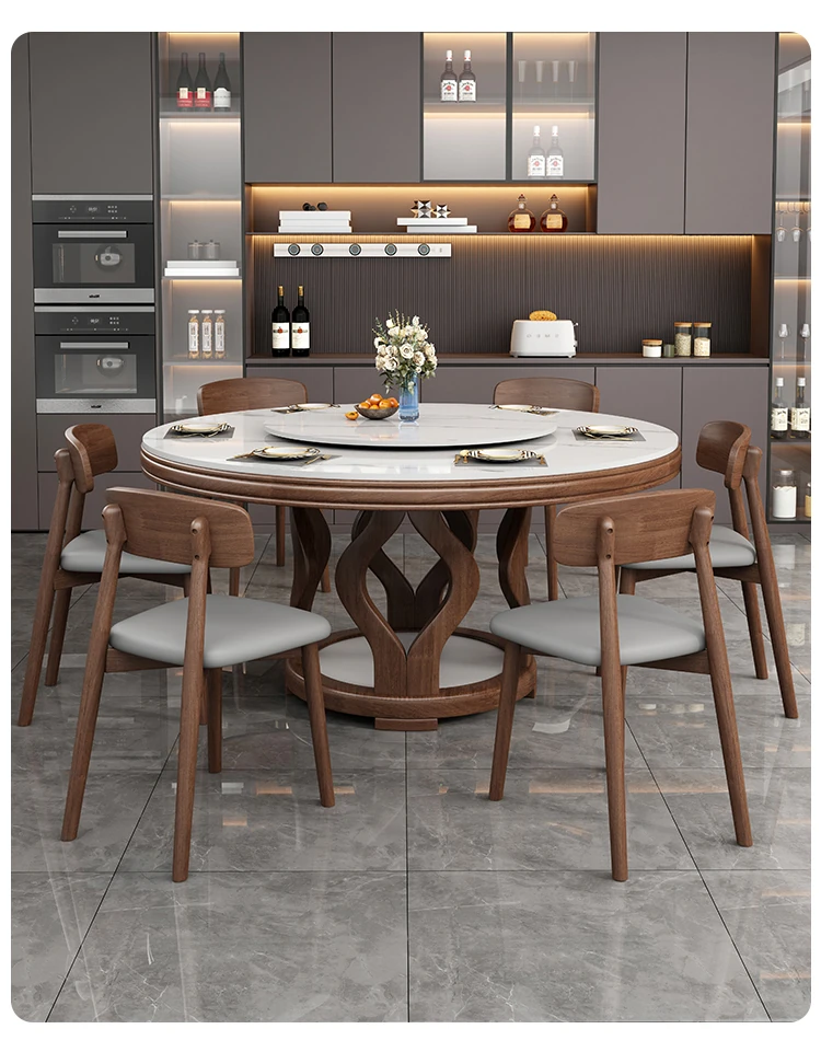 モダンミニマリストの無垢材と大理石のダイニングテーブルセット - 回転式コンロ付きの円形テーブルと椅子の組み合わせ、贅沢な食事体験を演出します!