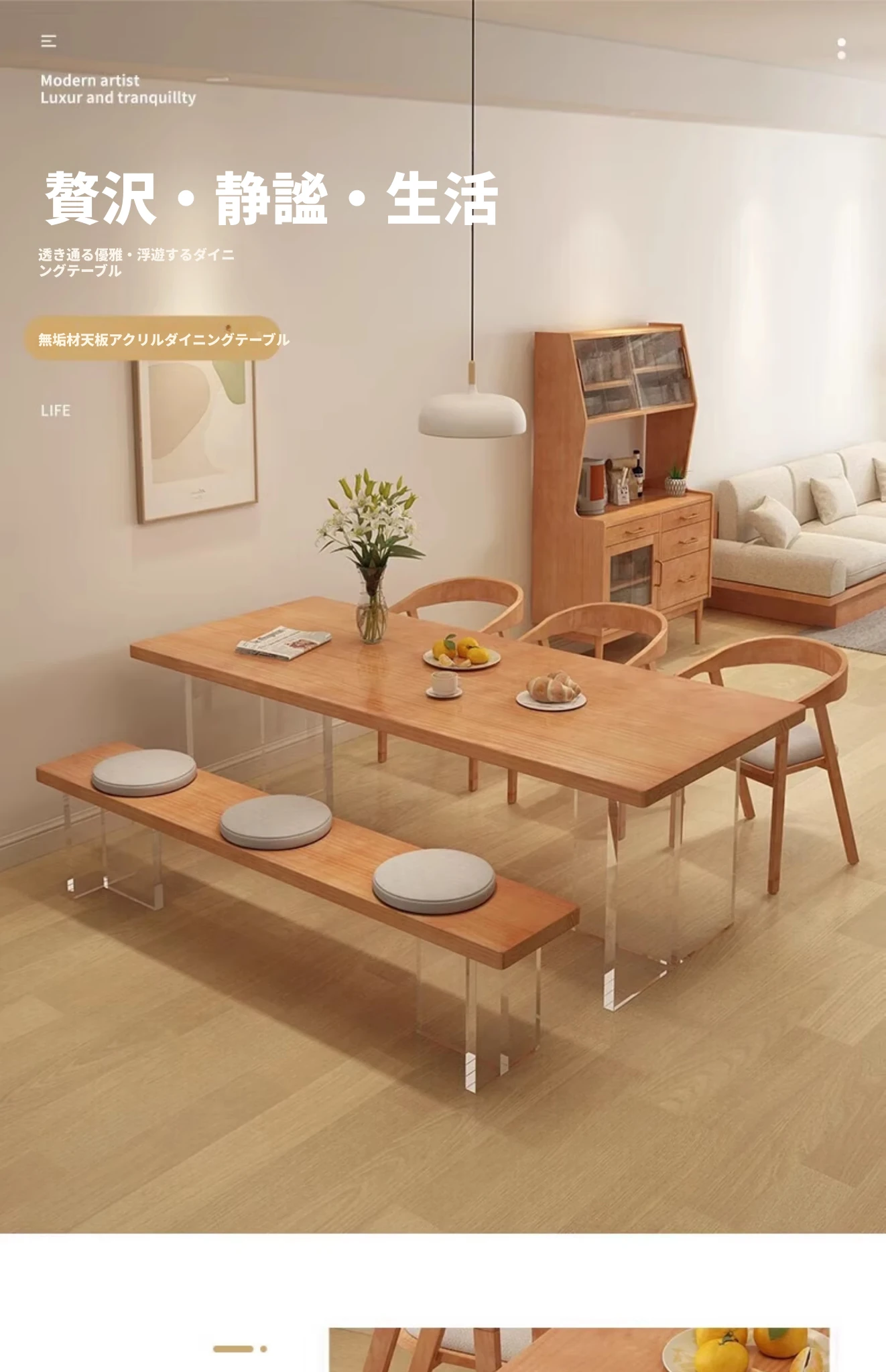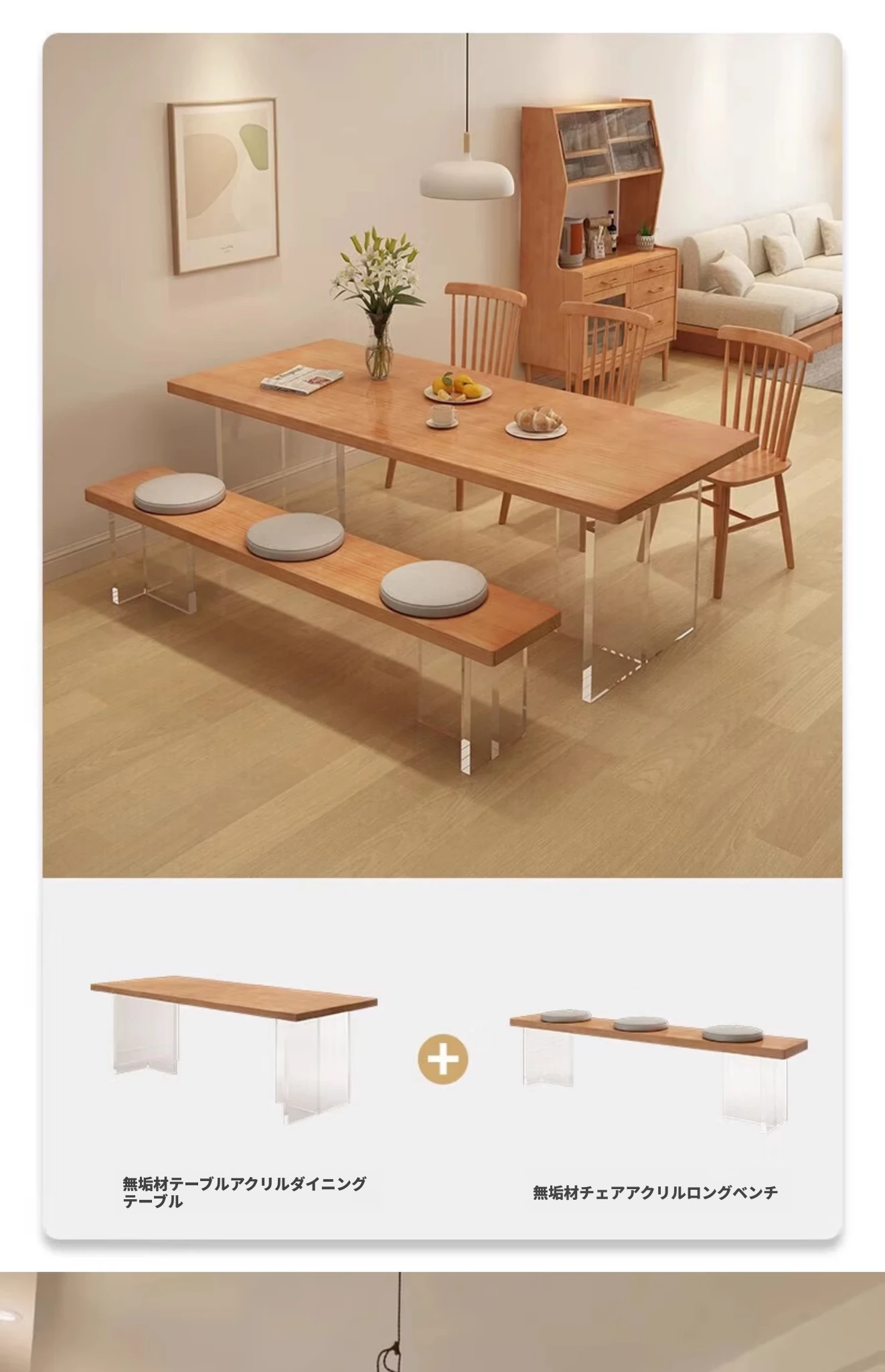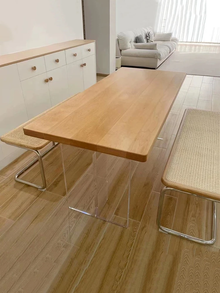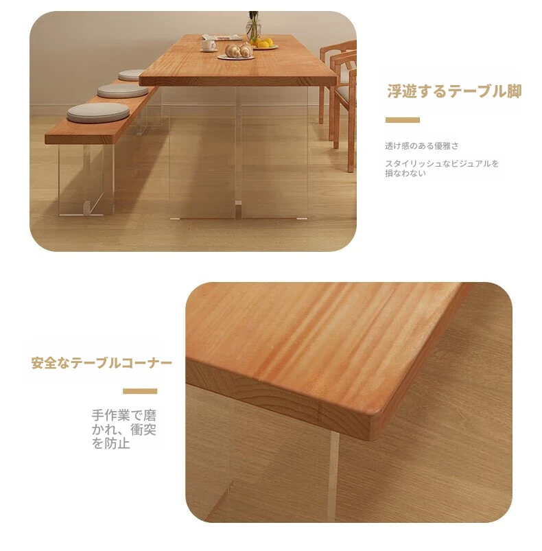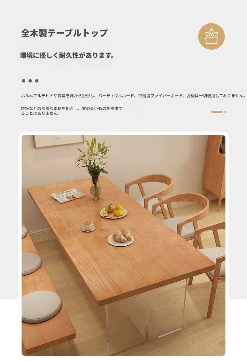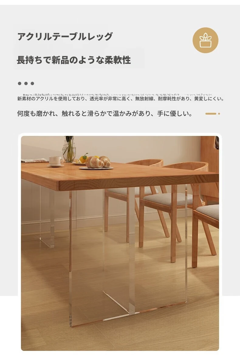 北欧スタイルの無垢材ダイニングテーブル&チェアセット - アクリル浮遊デザイン、モダンでシンプルな小型住宅向け長方形テーブル!おしゃれな空間を演出し、家族や友人との楽しい食事時間を提供します。