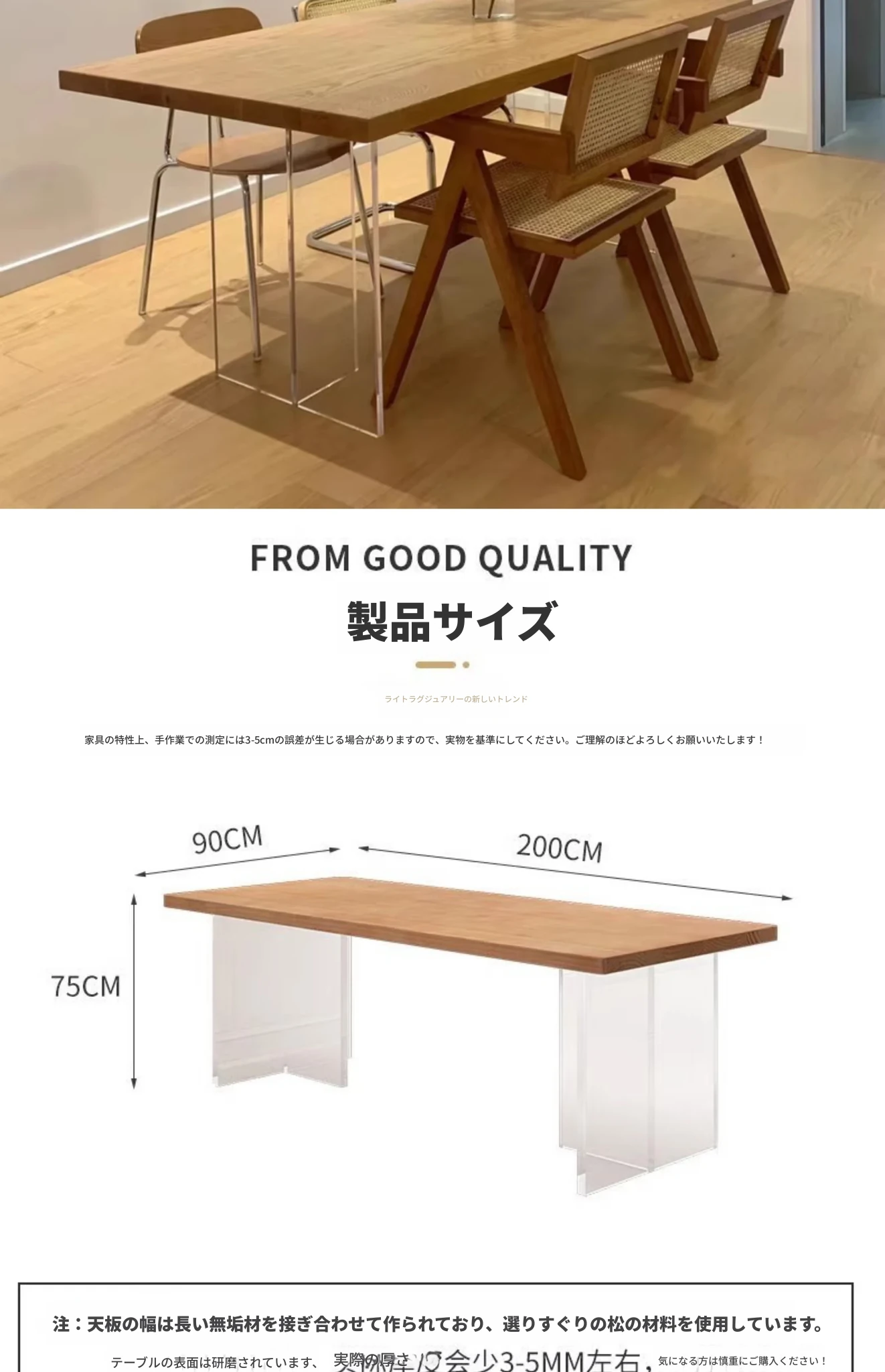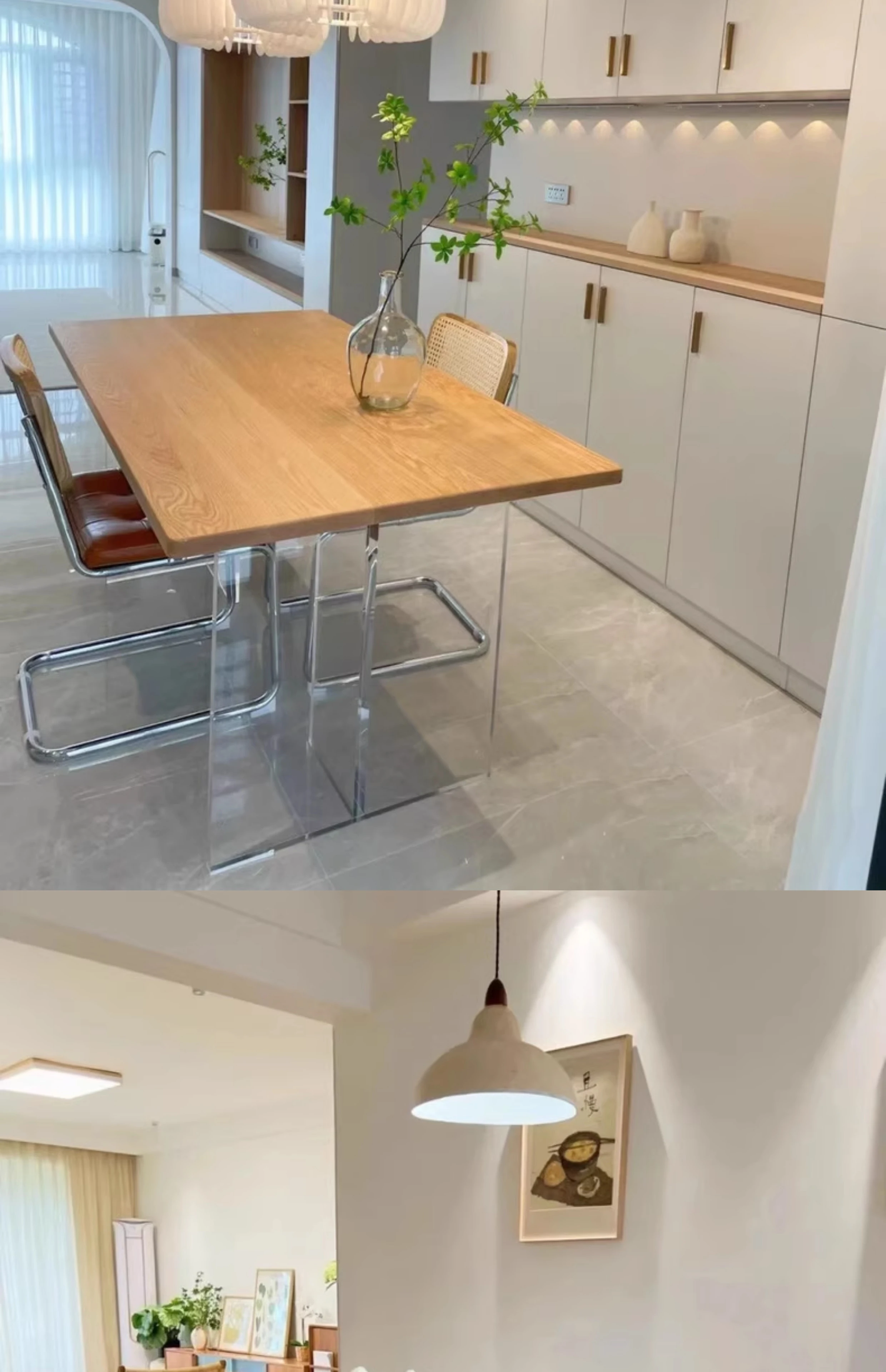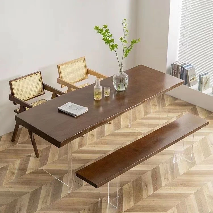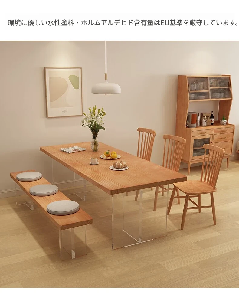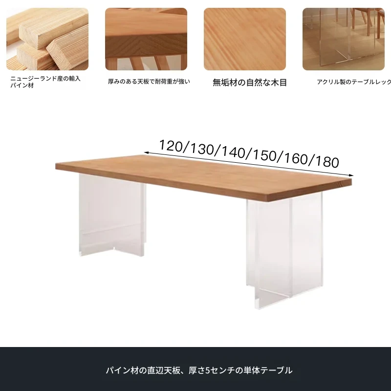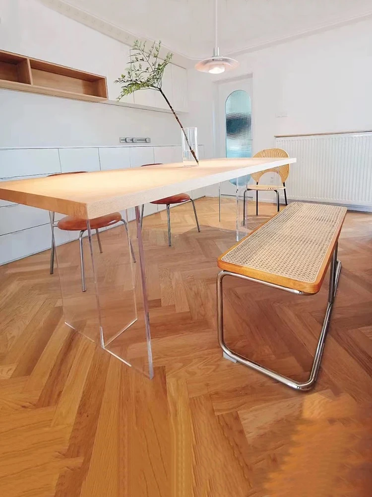 北欧スタイルの無垢材ダイニングテーブル&チェアセット - アクリル浮遊デザイン、モダンでシンプルな小型住宅向け長方形テーブル!おしゃれな空間を演出し、家族や友人との楽しい食事時間を提供します。